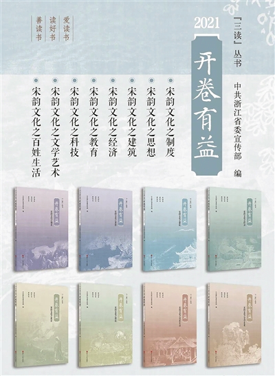 “三读”丛书是中共浙江省委宣传部根据习近平总书记提出“领导干部要爱读书、读好书、善读书”、大兴学习之风的要求而编选的,共出版《开卷有益·宋韵文化之制度》《开卷有益·宋韵文化之经济》《开卷有益·宋韵文化之思想》《开卷有益·宋韵文化之文学艺术》《开卷有益·宋韵文化之教育》《开卷有益·宋韵文化之科技》《开卷有益·宋韵文化之建筑》《开卷有益·宋韵文化之百姓生活》8种图书。每种图书分为“概述”“名篇”“解读”“风物”四个板块。“概述”是对本卷主题作总览式介绍,概括了这一宋韵文化形态的突出特点、发展过程、深远影响等;“名篇”汇编了有关这一宋韵文化形态的名篇佳作,主要以宋代文学作品为主;“解说”精选近现代著名宋史学者关于这一宋韵文化形态的理论文章,帮助读者把握其精髓;“风物”汇编与宋韵文化形态有关、现今保留于浙江省的历史遗存。