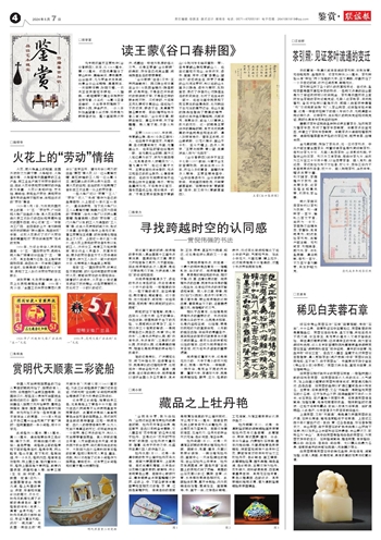 元末明初画家王蒙所作《谷口春耕图》,纸本,纵124.9厘米,横37.2厘米。该图远景描绘了崇山峻岭,高峰耸突,瀑布高悬,山谷幽深,几处茅舍点缀其间。近景谷口山溪蜿蜒、潺潺而流,一片田野平畴、阡陌交错,一农夫正在扶犁驱牛耕地,一人插秧,一峨冠博带之高士手持拐杖在旁观看,小溪边一头戴斗笠者在垂钓。小溪旁绿树掩映下一草庐小院,房舍俨然。一仆人手拎饭盒望着小溪对岸,好像是为耕种者送饭。整个画面层次井然,透露出一股世外桃源的恬淡之气。这是王蒙借“谷口躬耕”的典故,抒发自己远离尘嚣、闲适隐居生活的思想情感。