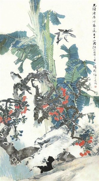 任颐,字次远,号小楼,后改名颐,字伯年,别号山阴道上行者、寿道士等,浙江山阴(今绍兴)人,自幼随父卖画,后从任熊、任薰学画。在“四任”之中,成就最为突出,是“海上画派”中的佼佼者,“海派四杰”之一。他的花鸟仿宋人双钩法,赋色浓厚,白描传神,颇近陈洪绶。这幅画芭蕉叶以浓墨中锋勾勒轮廓,线条圆润流畅,富有表现力。叶面以饱含水份的花青、石绿、明黄等色晕染,色与水自然交融,显现出丰富的深浅色调的变化,将叶片鲜活的物性表现得淋漓尽致。画中的怪石和樱桃树的枝干则以淋漓的水墨挥写,墨色浓淡相衬,自然渗透,能看出在阔笔墨迹中的按、提、顿、挫、疾、缓,大都悬腕抒写,气韵流畅,笔笔生动,挥洒自如。画中的小鸟没有繁琐的细节刻画,仅以寥寥数笔便点染出它们在静止状态下专注的神态和自由飞翔的动态,由此可见作者敏锐的观察力、坚实的素描基础和娴熟的笔墨造型能力。