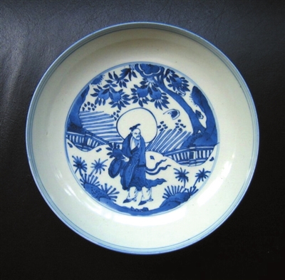 这瓷盘上画的是“东方朔偷桃”的典故。东方朔,本姓张,字曼倩,西汉平原郡厌次县(今德州陵县)人。西汉时期著名的文学家。汉武帝即位,征四方士人。东方朔上书自荐,诏拜为郎。后任常侍郎、太中大夫等职。他性格诙谐,言辞敏捷,滑稽多智,常在武帝前谈笑取乐,他曾言政治得失,陈农战强国之计,但当时的皇帝始终把他当俳优看待,不以重用。