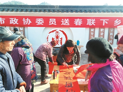 近日,“衢州市政协委员送春联下乡”活动在衢州常山县东案乡田蓬村举行。八位来自文化艺术界的市政协委员和书法家挥毫泼墨,给广大村民带去新春祝福。通讯员 夏亮俊 摄