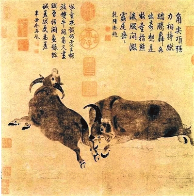 唐朝诗人颜仁郁在《农家》一诗中写道:“半夜呼儿趁晓耕,羸牛无力渐艰行。时人不识农家苦,将谓田中谷自生。”农耕时代,人类驯养牛最重要的目的是为了耕地。牛生性憨厚,体态健硕,干活任劳任怨。因此,历代文人都热衷于以诗歌的形式赞颂牛的品格,他们的诗作或绘其形态、或赞其精神,借以抒怀咏志,留下了许多脍炙人口的名篇力作。唐朝陆龟蒙的《五歌·放牛》云“荒陂断堑无端入,背上时时孤鸟立”,写牛的性情温和;宋代梅尧臣的《耕牛》云“破领耕不休,何暇顾羸犊。夜归喘明月,朝出穿深谷。力虽穷田畴,肠未饱刍粟。稼收风雪时,又向寒坡牧”,则是写出了牛的吃苦耐劳精神。宋代李纲《病牛》诗云:“耕犁千亩实千箱,力尽筋疲谁复伤?但得众生皆得饱,不辞羸病卧残阳。”李纲以病牛的不辞辛劳,来抒发自己为国尽忠、老而弥坚的满怀壮志。