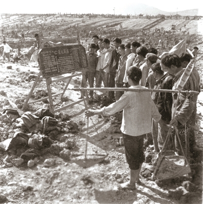 上世纪六七十年代,黑板报是一种常见的群众性的宣传工具,它在学校、工厂、农村、街道等有广泛的应用,黑板报还与干活的农民一起走向了田头、工地,及时告示上级重要通知、劳动进度,表扬好人好事等。图为1978年在开挖杭嘉湖南排出海工程长山河工地上,民工们正在观看新编写出来的黑板报。照片提供者:朱积良