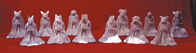 隋灰陶十二生肖俑,通高29厘米,武汉市武昌区岳家嘴出土,收藏于武汉博物馆。这组生肖俑一共十二件,分别为鼠俑、牛俑、虎俑、兔俑、龙俑、蛇俑、马俑、羊俑、猴俑、鸡俑、狗俑、猪俑,均为泥质陶,通体施有彩绘,由于年代久远,彩绘大多已经脱落。各生肖俑均为生肖首、人身,身穿宽袖交领长袍,腰束丝带,呈坐立姿势,双手合抱于胸前,仿佛在打躬作揖,洋溢着一缕浓郁的吉祥气息。细细端详,十二生肖俑的塑造各依其态,有的圆睁大眼,咧嘴露牙;有的嘴唇紧抿,微露笑意;它们或诚实憨厚,或机敏诙谐,或虎头虎脑,或不怒而威,或木讷沉静,无不仪态端庄,造型生动,栩栩如生。尤其是细部的刻画颇具匠心,弯曲的羊角上纹饰清晰,鸡头肉垂褶皱分明,龙角高耸,猪耳肥硕,鼠目透着一丝机警。隋代时间较短,陶器在继承南北朝风格的同时又有所变化,器物造型更显饱满厚重。这组生肖俑胎体厚重,器型豪放,十二生肖均着统一服饰,正襟危坐,表情各异,纹饰细腻简练,神态生动传神,颇具气势,在一定程度上体现了隋代陶文化的个性特征。