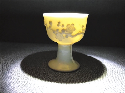 这件清初德化白瓷梅花杯(见图),圆口,高圈足。杯内中空,腹壁斜收,杯口以下腹壁上有手工捏塑而成的竖向凹纹,杯体从杯口到腹部逐渐变薄,腹中部瓷胎最薄,盛液体后在强光下杯外壁能显出杯中液体。杯体通身施白釉,均匀凝润,釉色温润柔和,白色中呈淡淡微黄。杯底圈足露胎,胎釉交界浑然一体,无明显界限,露胎圈足白晰致密,细腻均匀,呈水磨糯米状。外壁塑一桩老梅,枝干遒劲,花叶舒展,模印清晰,造型别致。看着满杯的清酒,不免让人联想到一首诗:“疏影横斜水清浅,暗香浮动月黄昏。幸有微吟可相狎,不须檀板共金樽。”