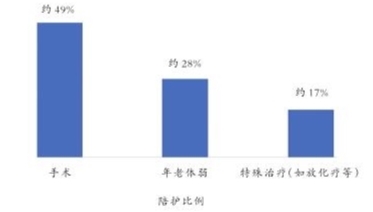 从陪护原因进行分析,手术患者陪护比例最高,占比约49%,其次是年老体弱和长期住院患者,占比约28%,接受特殊治疗患者需要陪护的占比约17%。