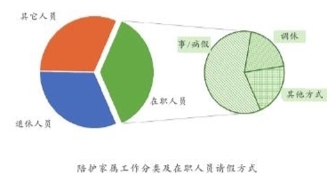 家属陪护人员的职业方面,在职人员约占36%,退休人员占比约31%,其他人员占比约31%。进一步对在职人员陪护的时间来源进行分析,发现通过向工作单位请事假、病假的占比约59%,通过调休的占比约19%,其他方式的占比约20%。由于在职人员还要兼顾工作,频繁出入病区,一定程度增加了院内感染风险。