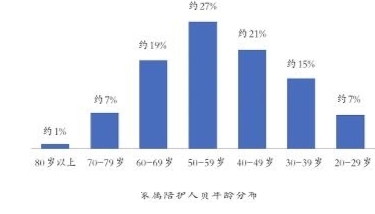 调查中将家属陪护人员分为7个年龄段进行统计,其中家属陪护人员以60岁以下年龄段人员最多,占比约71%;50~59岁约占27%;49岁以下年龄段占比约44%,这类人多是用人单位的骨干,一定时间内放弃单位工作来陪护,很无奈。