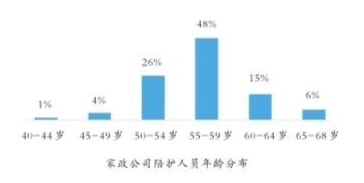 家政公司护工年龄分布以55~59岁年龄段的人员最多,占比48%;60岁以上人员占比21%;综合数据显示,50岁以上人员占比95%,护工年龄较大。选择护工工作主要是因为没有其他一技之长,缺乏职业规划,工作主动性较差。
