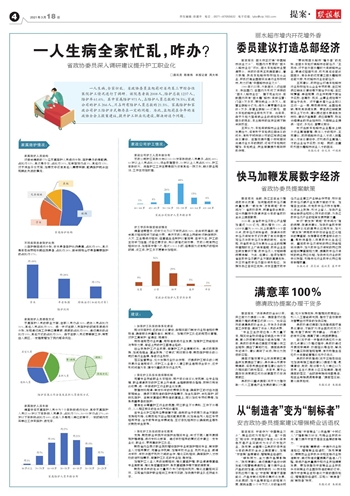 一人生病,全家忙乱。省政协委员孟旭莉对省内某三甲综合性医院护工情况进行了调研。该院患者数2008人,陪护总数1237人,陪护率61.6%。其中家属陪护971人,占陪护人员总数的78.5%;家政公司的护工266人,只占所有陪护人员总数的21.5%。家属陪护和家政公司护工陪护方式都存在一定的问题。为此,孟旭莉在今年的省政协全会上提案建议,提升护工职业化建设,解决好这个问题。