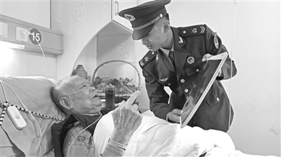 绍兴市政协“爱心社”曾在去年开展慰问农村抗美援朝老兵活动。“浙江政协同心苑”微信公众号宣传报道后,解放军某部联系到了老战友张爱苗,并来嵊州慰问看望,圆了老人找部队、寻战友的心愿。图为年轻战士向老战友介绍部队强军新貌。通讯员 赵琳 吕烨沙