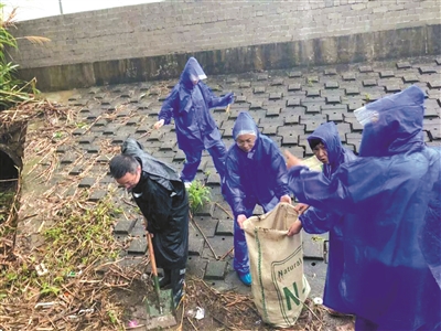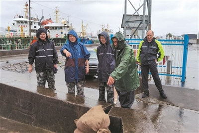 | 普陀区政协委员周挺组织突击队伍,冒着风雨,在堤坝处加固防汛工事。 |