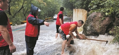| 桐庐县政协委员姚明珠参与道路清障,并对民宿入住游客和来景区游玩的车辆进行劝返。 |