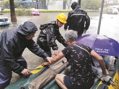 | 宁波市海曙区政协机关干部奔赴鼓楼街道受淹地区,与街道工作人员一起连续作战,用皮划艇将群众及时转移至安全区域。 |
