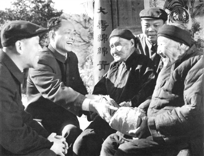 1984年,时任黄岩县委书记的张植辉(左一)、县长王德虎(左二)翻山越岭到大巍头村慰问百岁姐妹鲍宗冰、鲍宗美,祝愿她们健康快乐,共享改革开放的好日子。照片摄于1984年12月。照片提供者:黄政