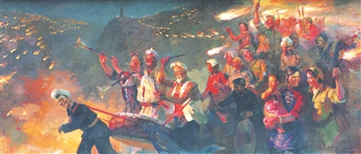 油画《延安火炬》是我国当代著名油画家蔡亮先生创作于1959年的作品,表现的是1945年抗战胜利后,延安军民举行火炬游行,欢庆胜利的情景。