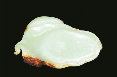 这件清代和田白玉树叶寒蝉纹笔舔,整器以整块和田白玉为材,精雕细琢作一梧桐叶,一面为砚池,一面陷地阳雕叶脉,侧面应用天然玉皮刻一金蝉,须爪宛然,栩栩如生。玉质莹润光滑,造型精巧别致,梧叶与寒蝉相结合,寓有“一叶知秋”之意。