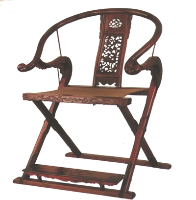 明代交椅以造型优美流畅而著称,它的椅圈曲线弧度柔和自如,俗称“月牙扶手”,制作工艺考究,通常由三至五节榫接而成,其扶手两端饰以外撇云纹如意头,端庄凝重。后背椅板上方施以浮雕开光,透射出清灵之气,两侧“鹅头枨”亭亭玉立。座面多以麻索或皮革所制,前足底部安置脚踏板,装饰实用两相宜。在扶手、靠背、腿足间,一般都配制雕刻牙子,另在交接之处也多用铜装饰件包裹镶嵌,不仅起到坚固作用,更具有点缀美化功能。