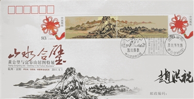2011年6月1日,在两岸有识之士的共同努力下,“山水合璧——黄公望与《富春山居图》特展”在台北故宫博物院开幕,一幅有着661年历史、一分为二361年、分藏两岸61年的元代名画,在两岸同胞的共同期待中,终于“破镜重圆”。时任浙江省委书记赵洪祝率浙江代表团见证了这一历史性的庄严时刻。为配合这次特展,富阳市邮政局特发纪念封一套。我藏有特展纪念封一枚。