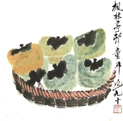 柿子入画也入药,《本草纲目》记载柿子“有健脾涩肠,治嗽止血之功”。新鲜的柿子味甘、涩,性凉,具有清凉润肺、生津止渴的功效。柿叶则有助消化的作用。记得小时候,吃坏了肚子,消化不好,母亲就用柿叶煮水给我喝,以助消化。