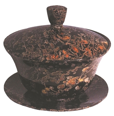 这件梅花玉茶盏,下有底盘,上有圆盖。整个盏面,黛青的底色上布满了绛紫色连枝梅花。天然的梅,疏影浓淡相宜,清逸飘洒自如,撇一眼便会乐淘其中,舒心开怀。说起材质和质地,更是精巧难寻。很多人都知道和田玉、岫玉和独山玉,这非脂非翡的梅花玉,更稀少而奇绝了,温润滑腻的梅花玉茶盏,自然成为稀珍之物。