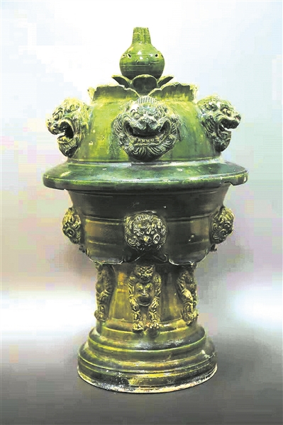 阳泉博物馆收藏的平定天宁寺西塔地宫出土的绿釉陶香薰炉,高37厘米,底径15厘米,子母口。盖顶部中央置直口瓶,葫芦形状,葫芦柄被削去半截,露出浅色胎,中有圆眼。瓶身设4个对称的叶状镂空小眼。下设双层五瓣仰莲,恰似盛开的莲花,盖壁设5只张牙怒吼的兽首作出烟道。熏腹为覆莲式,其上贴塑有5个等距的兽首。腹下的基座上由对称的5个胡人力士顶起,造型稳重而不呆滞,大力士低头挺胸,背上似乎有万钧之物,四层外扩喇叭形圈足,极富层次,给人美感。该香薰炉周身施绿釉,器內无釉。造型古朴,做工精细,显得肃穆、庄重。这个集镂雕、堆贴、刻划融为一体的艺术品,造型高大、新颖独特,极为精致,是当之无愧的镇馆之宝。