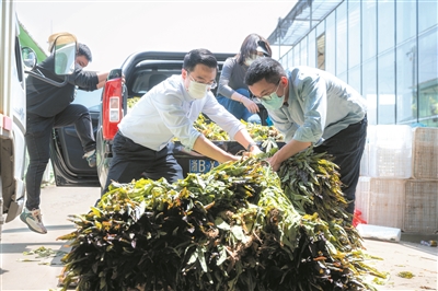图二:宁波市鄞州区政协委员嵇思涛、吴滨滨、袁媛等认购2000株莴笋、50多捆天菜蕻和青菜。这批蔬菜将随着防疫物资包配送到当地疫情“三区”范围内,提供给居民。 通讯员 鲍超波