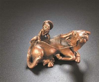 一件“牧牛童子”铜镇纸,将牛的忠实、牧童的天真和文人的意趣三者有机融合,堪称完美。