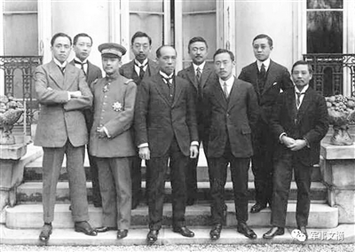 1919年,蒋百里随梁启超游历欧洲。图为他们在法国时的合影,前排中为梁启超,左二为蒋百里。 |