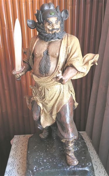 “常提三尺剑,壁上且逍遥。决眦除阴鬼,扬眉斩世妖。”在千百年流传过程中,钟馗已成为除妖的烈士,鬼魅的克星,可敬的鬼雄,可爱的人杰,百姓福祉的庇护神,人间正义的化身。中国工艺美术大师、婺州窑陶瓷艺术馆馆长陈新华创作的陶瓷《驱魔大神钟馗》表现出钟馗嫉恶如仇、怒铲人间不平的凛然气势。钟馗那带有符号式的胡须,显现其威慑鬼邪、凛然不可侵犯的神态;那逼人的眼光,显示了钟馗细微入神而又浑然天成的威力。你看,钟馗面对魔鬼作恶施邪危害百姓,怒目圆瞪,短须飘拂,高扬英眉,拔剑出鞘,正将施展法典,怒铲人间不平。其造型庄严含威武、凛然生神风,彰显出驱魔大神的风采。