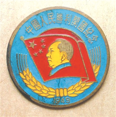 中央人民政府成立纪念章、开国纪念章、开国盛典纪念章、胜利开国纪念章等这些异彩纷呈的开国纪念章,真实地记录了中华人民共和国的成立,见证了崭新的红色政权的诞生。作为珍贵的历史文物,具有重要的历史意义和很高的收藏价值。这枚开国纪念章(见图)为铜质,直径2.8厘米,正面在国旗的正中镌有毛泽东主席像,顶部刻有“中国人民胜利开国纪念”铭文,两边设计有麦穗和齿轮图案环绕,底部有“1949”字样。此章设计严谨,蕴意丰富,工艺精美,具有鲜明的时代特征和民族特色。