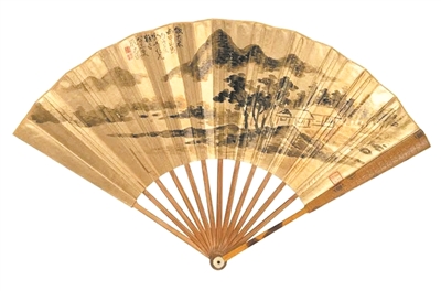 而庞元济先生的扇面之画,是仿北宋书画家米芾山水图,表现烟云风雨变幻中的江南山水,人称米氏云山。题款为:“仿大米雨中山图,丙戌夏云青仁兄雅正,八十三叟庞元济。”此成扇曾在2013年春季纽约苏富比拍卖会上,拍出1.5万美元(约人民币9.1万元)的价格。