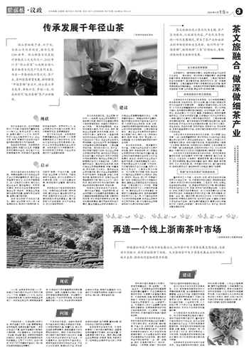加快谋划专业化茶叶电商产业园项目。结合浙南茶叶市场搬迁,在新市场中谋划再建一个专业化程度更高、集聚效益更明显、公共配套更齐全的茶叶电商集聚区,使其与浙南茶叶市场紧密相连,以此引导茶叶电商集聚发展,为他们提供系统化的供应链服务和公共服务,同时,也可以有力吸引县外茶叶电商、主播来松发展,进一步做大做强松阳茶叶电商规模。