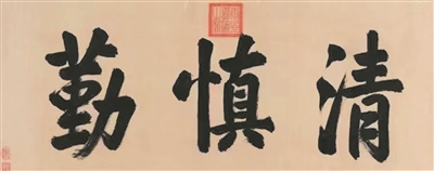 图中匾额的“清慎勤”三字,为康熙皇帝所书。匾额中上方钤有“康熙御笔之宝”大印。其规格49×122厘米,北京保利2011年秋拍成交价达1495万元。康熙堪称清代帝王中的书法家,而“清慎勤”三字在玄烨一生所书的字体中显示了其最成熟的风格。