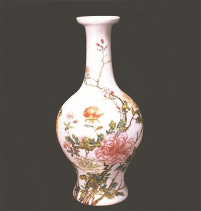 粉彩牡丹瓶是一件色彩洁润秀丽的艺术品。瓶身以争妍盛开的牡丹为主题,色彩鲜艳。从画面的操笔、设色的运用自如、花朵枝叶的勾勒渲染,都能说明画师的艺术成就。这一时期粉彩的表现手法,由于有些画家为瓷器绘彩提供画稿,因而使之具有淡雅宜人的格调。雍正粉彩不仅有白地绘彩,也有珊瑚地、淡绿地、酱地、墨地、木理纹开光粉彩和粉彩描金等品种。装饰技法虽各有千秋,但就绘画效果而言,莫过于白地彩绘更能体现瓷器与书画相结合的风格。