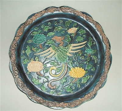 这是一件珐华彩盘,经仔细观察,应为明中期珐华彩凤穿牡丹纹盘,可谓价值不菲。