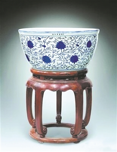 这件嘉靖青花缠枝莲大缸,体型硕大,通体满施白釉,釉色中闪青,釉层饱满肥厚,釉质凝润莹亮。口外绘青花双线纹,色泽略显清淡。腹部绘满青花缠枝莲纹,青色深沉而浓艳。口外书青花六字横款“大明嘉靖年制”,字体工整。器底无釉,露出黄褐色胎体。历经数百年,如此硕大而完整保存至今的嘉靖青花缠枝莲大缸颇为难得。