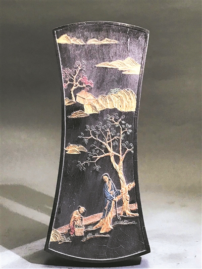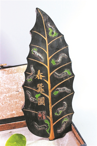 “蚕饥蚕娘愁,蚕饱蚕娘喜。”农人最欣喜的莫过于看见蚕宝宝大口咬食着桑叶。这是一块明代天启年间的“春蚕图”陈墨(图2),被匠人精心制作成了一片桑叶的形状。但见墨块之上,十只春蚕正在努力吃着桑叶,它们的咬食之处,露出了绿色的底色。墨块的背面则同样有8只春蚕尽情进食,同时还刻上了“衣被万方”四个大字。这四个字出自明代何吾驺的《圣寿赐文绮》:“圣明衣被恩难报,愿及垂裳遍万方。”墨块包浆醇厚,描金细致,墨色黑亮。