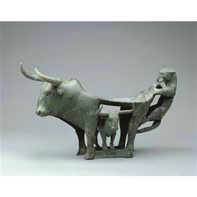 这件牛虎铜案,主体为一头站立状的大牛,肩部隆起,牛角飞翘,身体前倾,背部自然下落成案面,牛尾部是一只呈攀爬状的老虎,老虎张口用力咬住牛尾;大牛腹下中空,一头小牛横向站立在大牛前后腿之间,呈十字交叉形。大牛和老虎用模铸造,一次浇铸成型,小牛则是另外铸造,然后再焊接在大牛腹下。该铜案设计巧妙,造型完美,形象生动传神,既有中原地区青铜器的特征,又有浓郁的地方特色和民族风格,充分体现了古人丰富的想象力和高超的艺术创作水平,是云南青铜文化艺术的标志性器物,也是我国古代文化的稀世珍品。