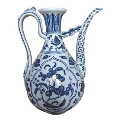 宋代诗人戴复古的《初夏游张园》:“东园载酒西园醉,摘尽枇杷一树金。”诗中正是描绘了一幅醉人的枇杷图。宜人的夏日,枇杷成熟了,像金子一般垂吊在枝头,晃晃悠悠,让人看了垂涎欲滴。这也是将枇杷代表富贵繁盛的寓意表现得淋漓尽致。枇杷以其优良的品质、独特的风味、稀缺的数量和珍贵的品质享誉数千年。自唐宋以来,枇杷一直被视为高贵、美丽、吉祥、财富和永恒的象征,成为皇家贵族珍贵的“贡品”。在这种吉祥理念的影响下,枇杷纹作为一个典型的陶瓷器装饰纹样,也被赋予了格外美好的吉祥寓意,这把青花枇杷纹执壶也足见当时匠人的心思巧妙。