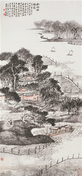 《南湖留胜迹》纵141.5厘米,横65.5厘米,采用传统山水画中的高远构图技法,通过上中下三个层面,描绘了包括烟雨楼和著名红船在内的南湖全貌,巧妙地契合了传统山水画固有的形式美感。其中,近景湖水涟漪,栅栏圈设的水面青萍荡漾,空间占比虽小,却浓缩了一派旖旎风光,水的流动跃然纸上,充满诗情画意。中景以位于画面中间的湖心岛和烟雨楼,以及岸边具有象征意味的红船为主体,比例上几乎占据了大半画幅,画舫细致形象,富有质感;老树虬曲,枝干劲挺,枝叶苍茂,充满勃勃生机。画家将自己的人生体悟和艺术修养,付诸笔下的建筑、树木、人物与游船,使之如同传统山水画中的符号元素,却又呈现出不同于传统山水画的艺术新貌,富于深邃的思想内涵。而远景中,湖水开阔如镜,烟波浩渺,水天一色,大片留白给人以疏朗幽旷、笔简意远之感。最远处几叶小舟张帆而上,岸边柳树轻盈,更是渲染出了苍茫沉雄的文人诗意。