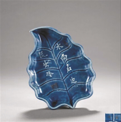 这是一件清代嘉庆时期的霁蓝釉艾叶形笔洗,长15厘米,洗口内敛,洗内随边沿的起伏划出叶脉纹,妙颖生动,形象逼真,看上去就像一片迎风舒展的艾叶,筋脉清晰可见,彰显一派盎然生机,微风飘过送来了缕缕馨香,令人心醉。笔洗设计精妙入微,内外施霁蓝釉,釉色深沉匀净,极为雅致,足可看出艺匠对于文房小品之匠心。笔洗上还有“水向石边流出冷”七字行书,源自宋朝高僧释师观的《颂古三十三首》:“未审魂灵往寻方,无栖泊处露堂堂。水向石边流出冷,风从花里过来香。”用巧妙的比喻,阐述事物之间的相互影响,因果自在其中,颇有禅意。这件笔洗实用性与观赏陈设性并重,供置于书斋的案几之上,与砚池笔山相伴,充满诗情画意,做到了造型、装饰和釉水的完美结合,是一件不可多得的案头雅玩。