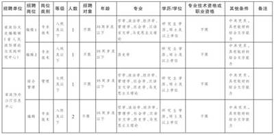 | 浙江省政协办公厅所属2家事业单位2023年招聘计划表 (共4个岗位) 注:年龄计算至报名截止日,35周岁及以下为1987年9月12日后出生。 |