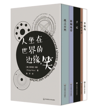 《人坐在世界的边缘,笑》形式新颖独特,由5部不同题材的文本合成,囊括百科全书、小说、哲学手记、录音转稿和漫画。奥地利新生代作家菲利普·韦斯在这部作品中,让5个不同时代、不同国籍、不同职业、不同性别、不同年龄的叙事者开口说话,从各自不同的视角去观察、反思世界的变化……
