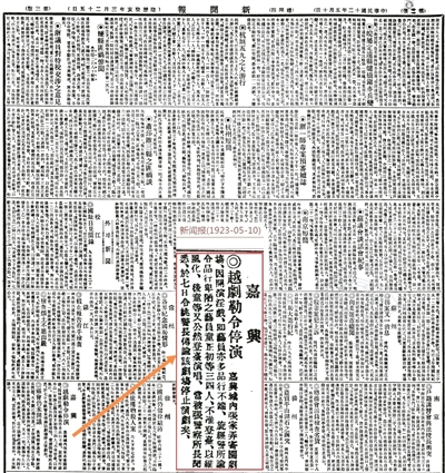 近期笔者在查阅民国时期文献时,在1923年5月10日出版发行的《新闻报》上检获一则报道:“嘉兴◎越剧勒令停演:嘉兴城内张家弄寄园剧场,因开演淫戏,即艺员亦多品行不端。旋经警所谕令品行卑陋之艺员童正初等三四人,不准登台,以维护风化。后童等又公然登台演唱,当被张警察所长闻悉,于七日令姚警长传谕该剧场停止演剧矣。”其中牵涉的演员童正初等人,当时在嘉兴城中登台唱戏,因有碍风化而被警所勒令停演。刊登此报道的《新闻报》为近代上海四大报纸之一,创刊于1893年,停刊于1949年。今上海图书馆收藏有完整的报刊资源。上世纪20年代,该报销量一度超过《申报》,代表了当时上海工商资产阶级的利益,广泛报道政治消息、各地新闻和商业贸易消息,为研究中国近代经济史提供了珍贵的史料。