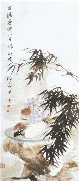 任伯年笔下的《中秋图》立轴,纸本设色,其纵93厘米,横42厘米,创作于1890年,现收藏于中国美术馆。从画面来看,一个青瓷的果盘置于表面平整的石块上,果盘中装有月饼、鲜藕和葡萄,这些中秋节令之物跃然纸上,历历可数。竹子有微风漾过之感,枝叶婆娑,笑弯了腰。画面背景中可见一轮满月似乎正在冉冉升起,清辉泻地。细细品赏画面,但觉此立轴分明是幅中秋赏月图,设色明净和谐,格调明快温馨,画面清新迷人,绝无矫作搜寻,情趣盎然。