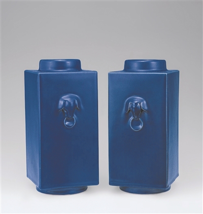 如清乾隆霁蓝釉象耳琮式瓶,瓶直口,短颈,平肩,方腹,平底,圈足。腹上部对称置象头铺首,象鼻衔环。通体内外及外底均施霁蓝釉,釉层较薄,瓶口、棱角及象耳、鼻、环等转折凸起处均隐现白色胎骨。外底霁蓝釉下署青花篆体“大清乾隆年制”六字三行款。