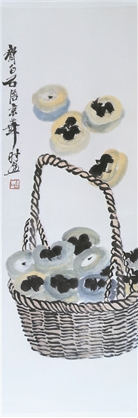 本文所附的齐白石《青柿图》创作于20世纪40年代晚期,其大小为99cm×34cm。从《青柿图》的画面来看,柿子为一种青灰色的方形柿子,除了装满一篮柿子外,还有四个柿子自然摆放在那里。他用水墨娴熟地表现出柿子的质感和形态,巧妙地把握好色和水的度,使画面中呈现的柿子新鲜嫩美,犹如带着露珠似的,尽情展示柿子的自然美,令人爱不释手。齐白石总用柿子这样最日常的题材进行创作,简单、自然、平实,饱含着对生活质朴而强烈的爱,显示了艺术大师的风范。