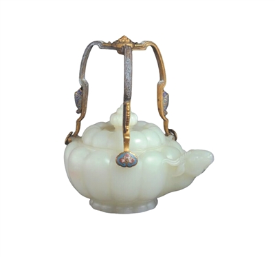 这把玉羊首提梁壶,外形酷似南瓜,通盖高10.1厘米,口径8.9厘米,足径6.8厘米。通体及盖、纽均雕作瓜棱状,腹部一侧凸雕羊首为流,羊角、耳、眼、胡须、牙齿甚至鼻翼等处均雕琢精细,栩栩如生。肩部设3个系纽,上接3柄如意形铜胎掐丝珐琅质地的提梁。壶底中部阴刻隶书“嘉庆御用”四字款。此壶造型独特典雅,玉白如脂细腻温润,弧度圆润优美,线条流畅飘逸,雕刻规整工丽。清乾嘉时期,宫中所造玉器数以万计,而此壶玉质之纯美、造型之精巧、寓意之美好,堪称翘楚。