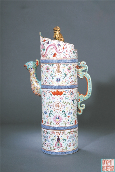 前几年,曾有一对高45厘米的清乾隆御制金胎掐丝珐琅缠枝莲纹龙柄多穆壶以9072万元人民币成交,引起收藏界注意。这一对多穆壶是皇家圣器,胎内含金量达30%,器物的龙柄尾部有明显区别,有公母之分。多穆壶作为乾隆养心殿造办处制造的御用陈设,除了造型上具有浓郁的民族风格外,还体现着藏、蒙、满、汉团结的主题,制造工艺上更是可圈可点:颈部拥有龙首鱼尾柄和龙首流;颈、腹部及盖面施天蓝色珐琅釉为底,装饰掐丝折枝莲纹,掐丝流畅,填釉饱满,釉色鲜艳且纯正;覆钵形盖,纯金宝珠钮;圈足外壁刻缠枝莲纹,长方框内刻“乾隆年制”楷书款。
